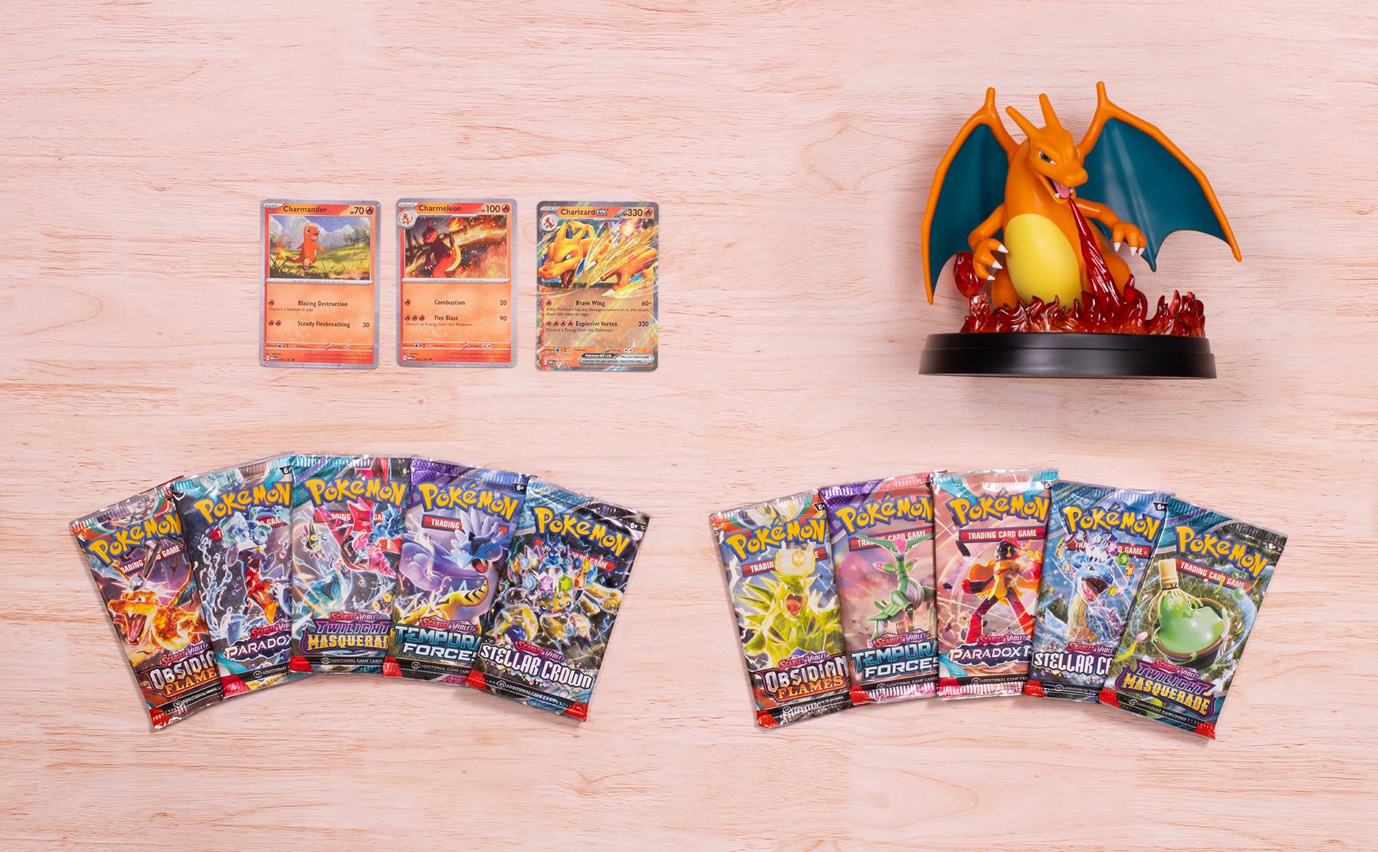 Mit explosiven Angriffen und riesigen PS hat Charizard ex eine beherrschende Präsenz auf dem Schlachtfeld. Erwecken Sie diese brennende Hartnäckigkeit auf Ihrem Schreibtisch, Bücherregal oder Nachttisch mit einer fantastischen Glurak-Figur mit durchscheinenden Feuereffekten, um eine Lieblingskarte zu präsentieren – wie den Folien-Charmander, Charmeleon oder Glurak Ex, die Sie auch in dieser Kollektion erhalten. Noch mehr Spaß erwartet Sie in einem Stapel von 10 Boosterpacks aus verschiedenen Pokémon TCG-Erweiterungen